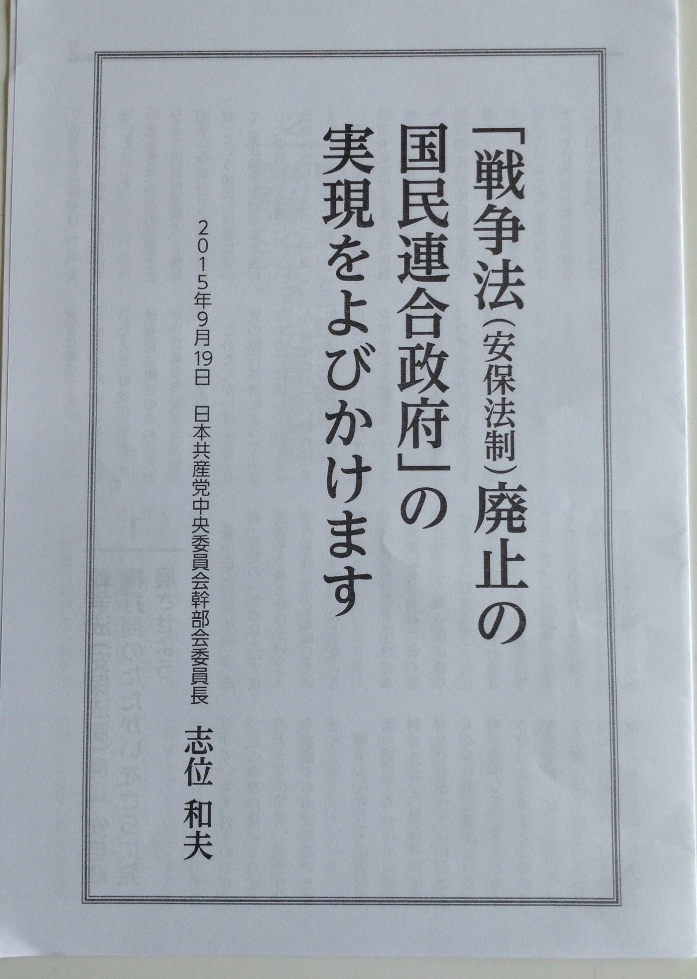 日本共産党「戦争法廃止の国民連合政府」の実現の呼びかけ