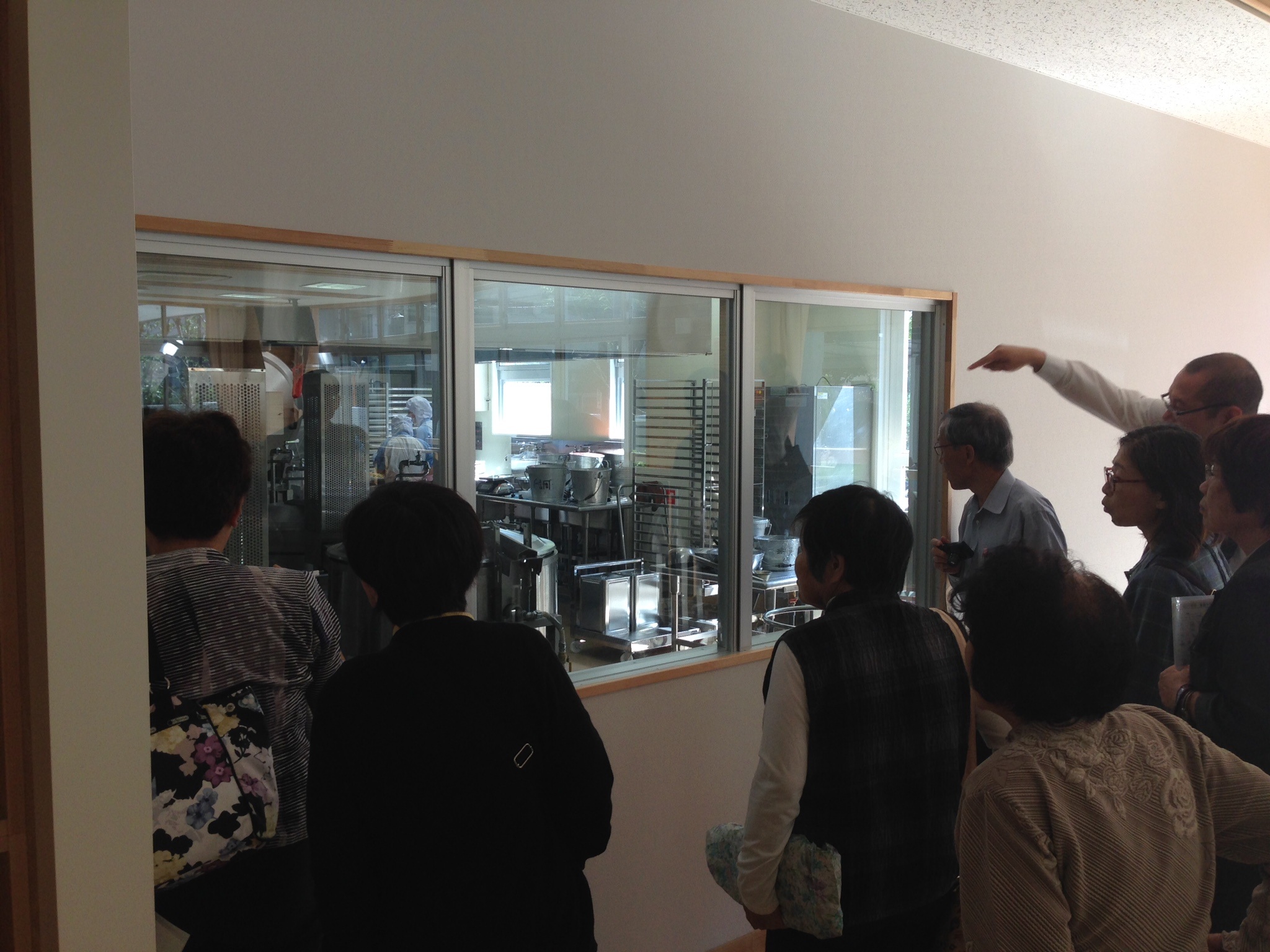 校長先生と養育委員会の方の案内で、2000食作る調理室、配膳室、各教室への流れを確認しました。